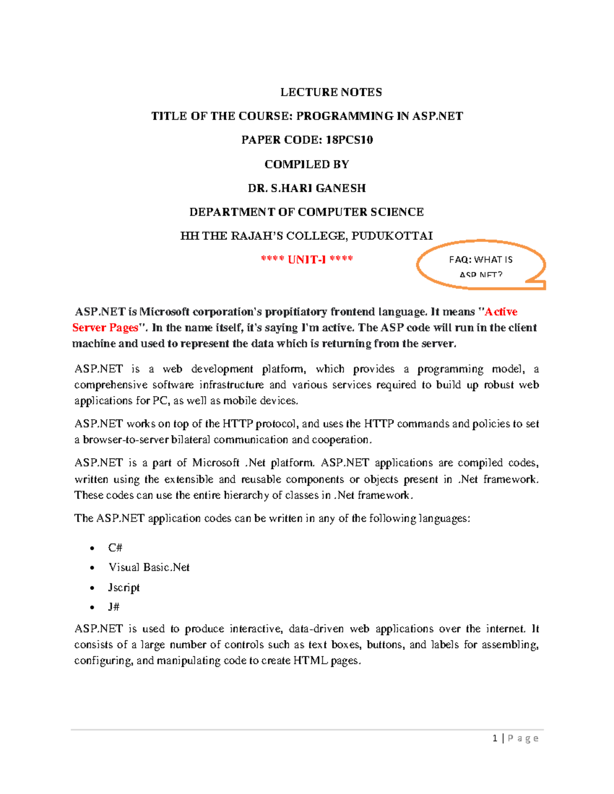 II MSC CS 18PCS10 ASP.NET DR S HARI Ganesh - LECTURE NOTES TITLE OF THE ...