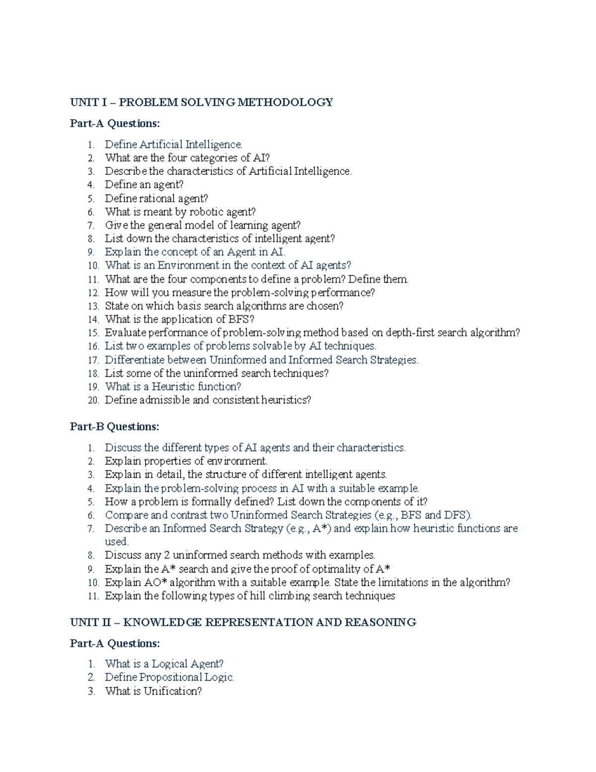 AIML QB: Unit I Problem Solving & AI Agents Questions - Studocu