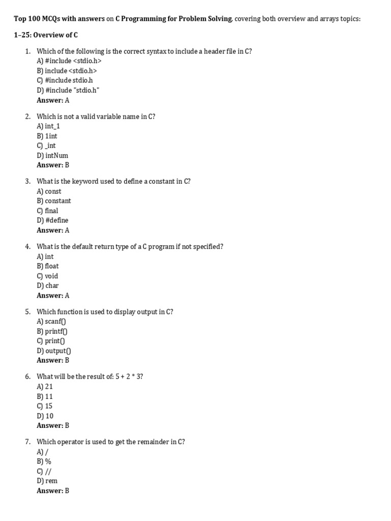 Top 100 MCQs On C Programming For Problem Solving | PDF | Integer ...