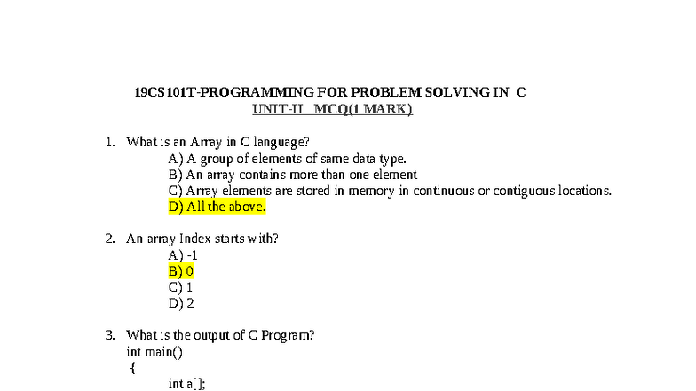 C Programming MCQs for Problem Solving (1 Mark) - Studocu
