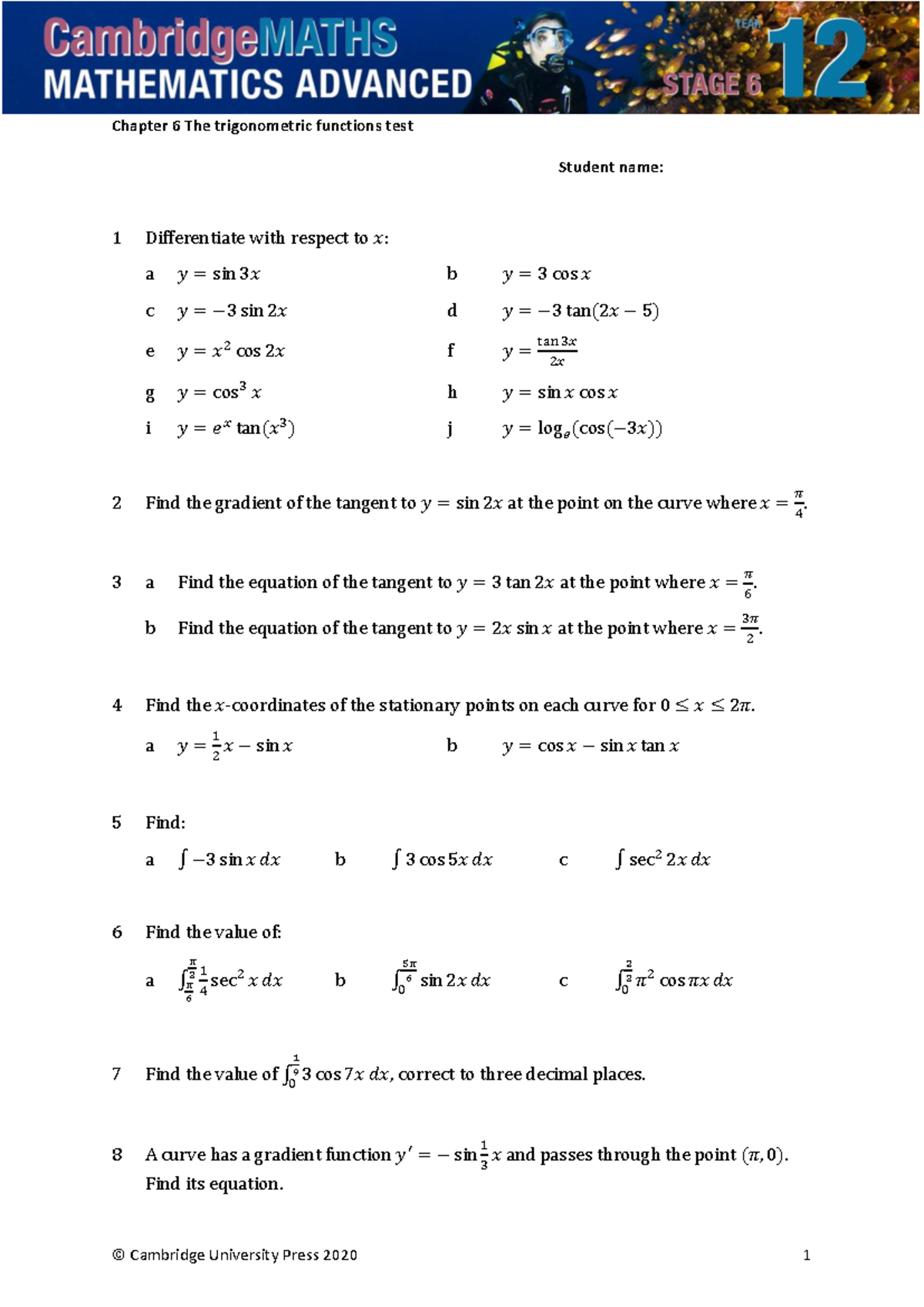 Chapter 6 Trigonometric Functions Test - Calculus Practice - Studocu