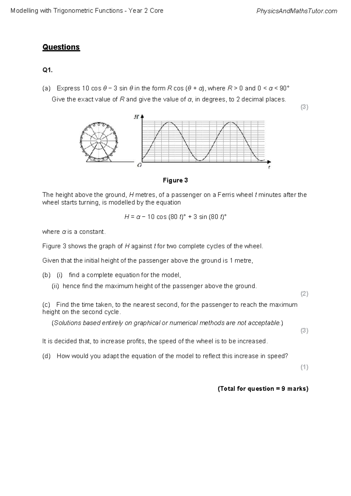 Modelling with Trigonometric Functions Year 2 Core Questions and ...