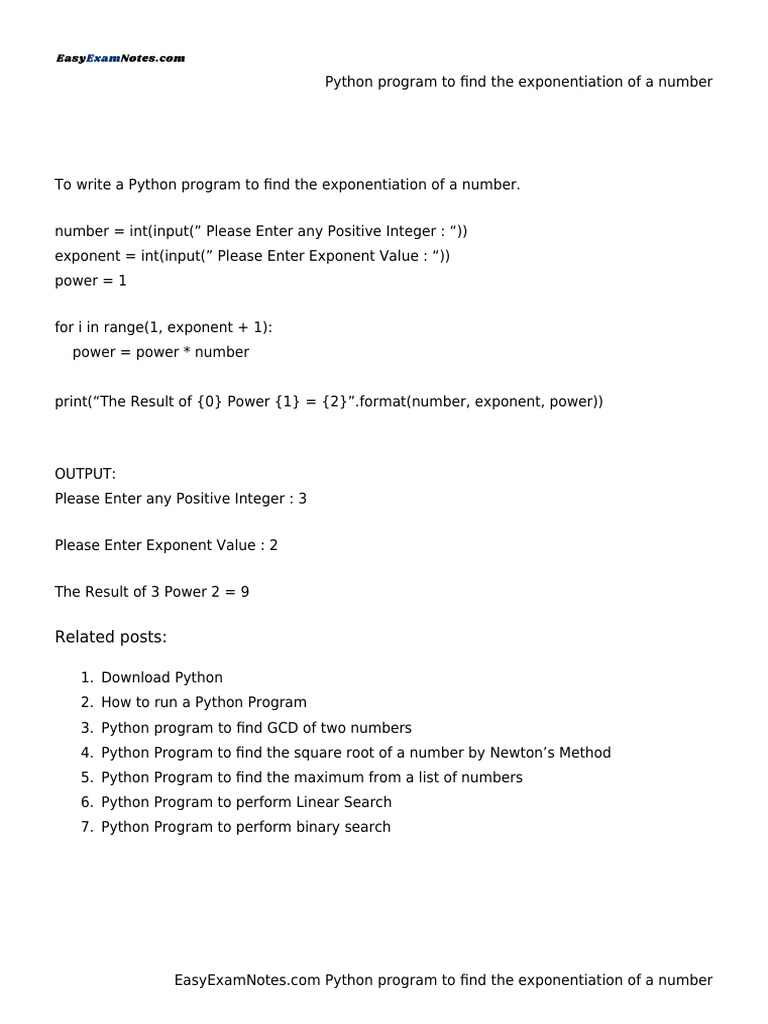 Based on this image's title: “Python Program To Find The Exponentiation of A Number | PDF”
