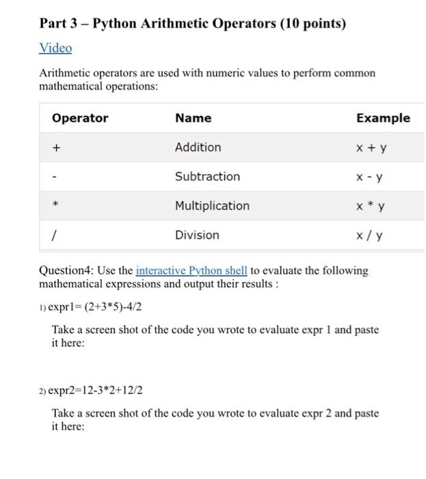 Based on this image's title: โSolved Part 3 - Python Arithmetic Operators (10 points) | Chegg.comโ