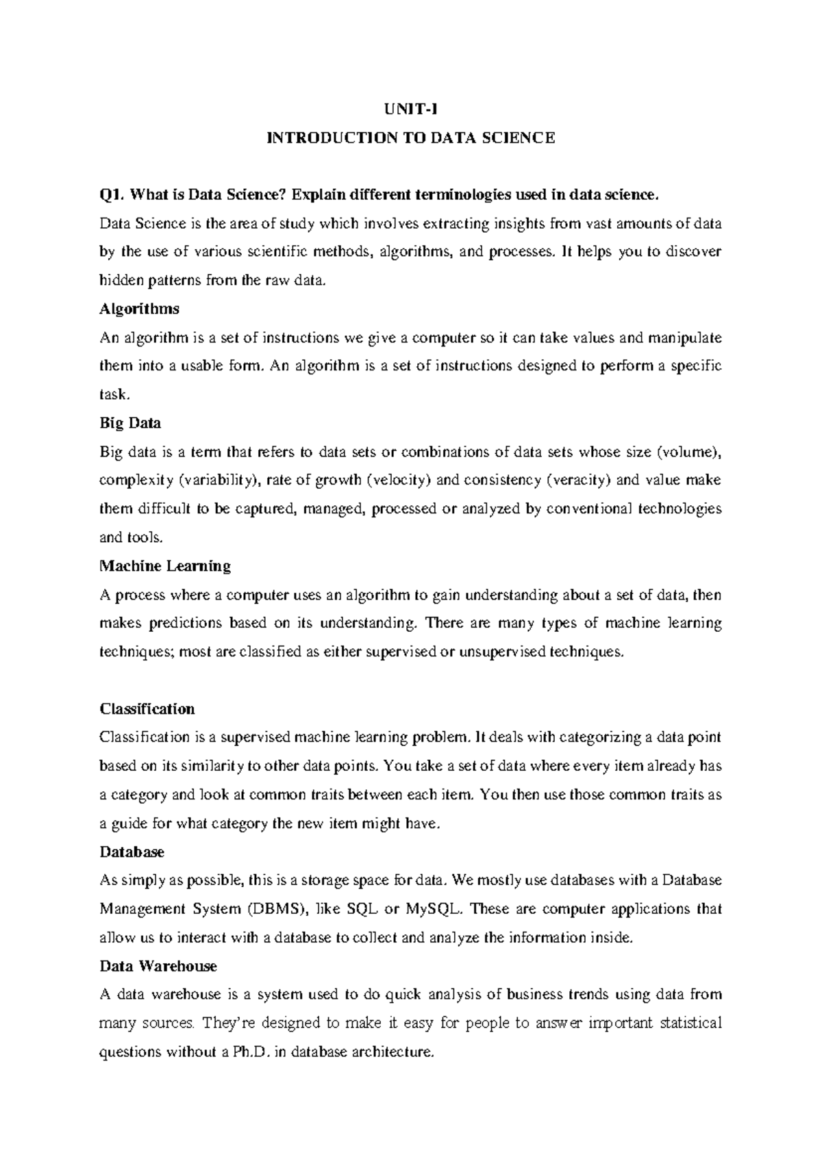 Unit no 1 Introduction to DS - UNIT-I INTRODUCTION TO DATA SCIENCE Q1 ...