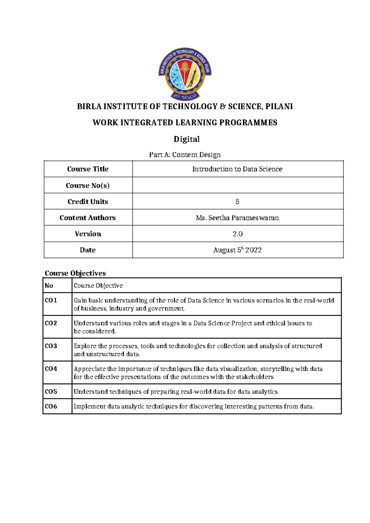 Introduction to Data Science Course Handout WILP Dated 12-Aug-22 - Studocu