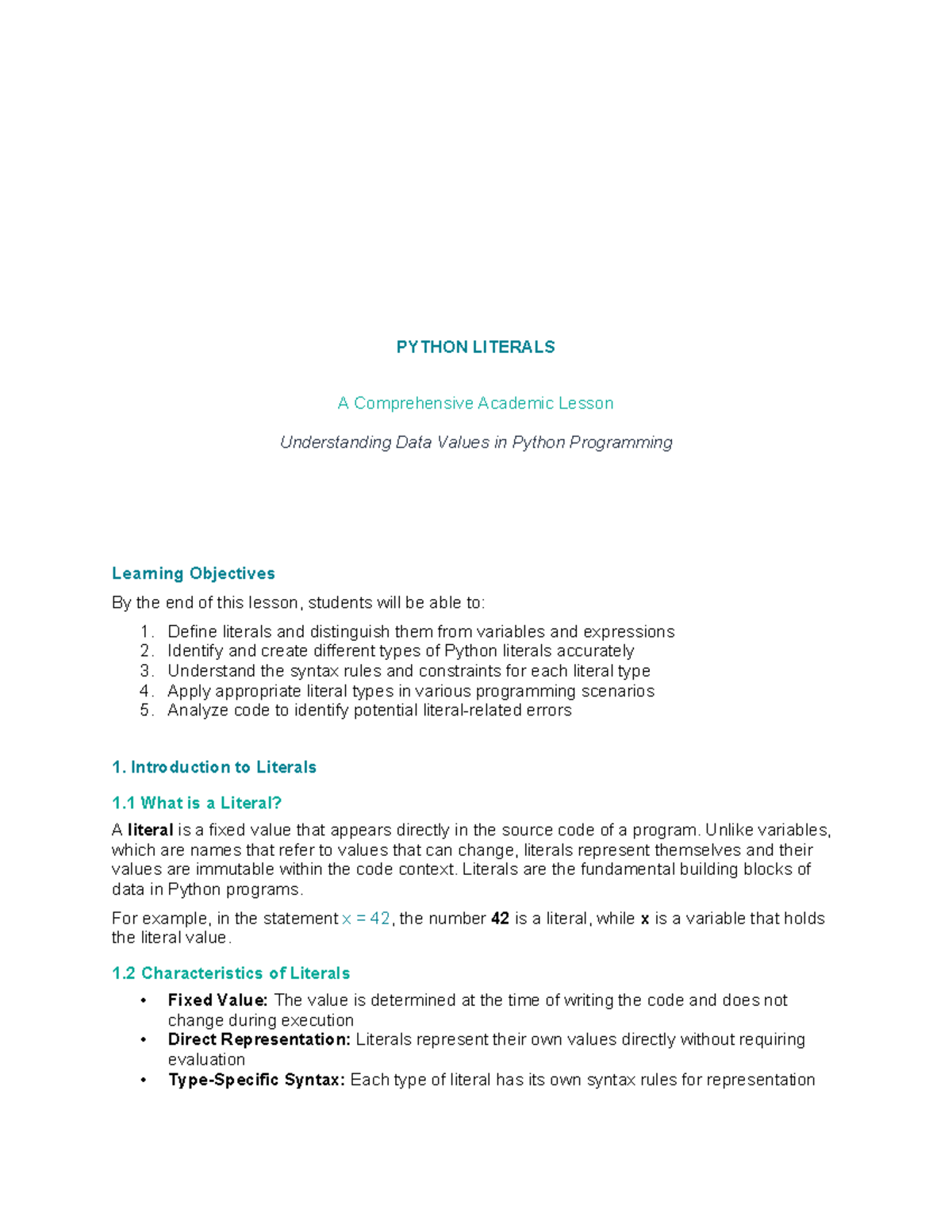 PYTHON 101: Understanding Data Values in Python Literals Lesson - Studocu