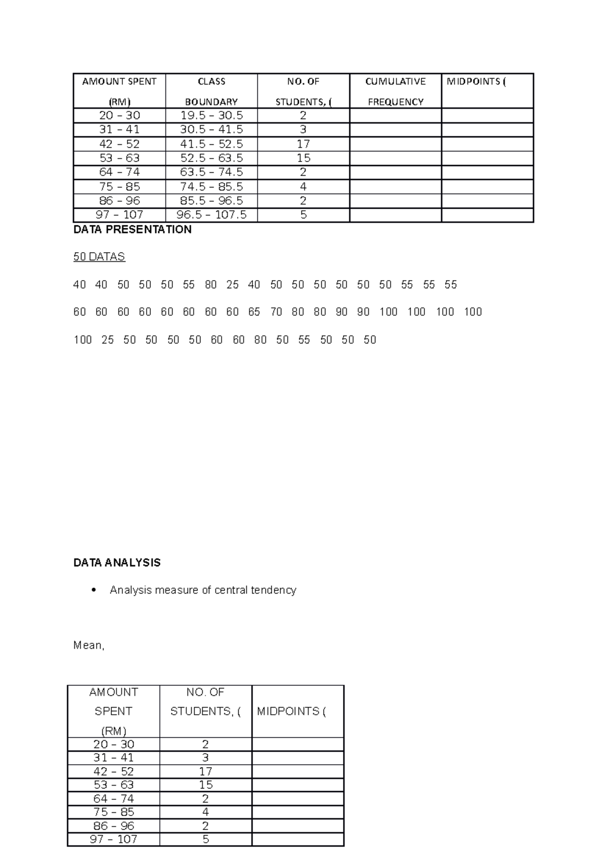TQM DATA Analysis - TUTORIAL STATISTICS - AMOUNT SPENT (RM) CLASS ...