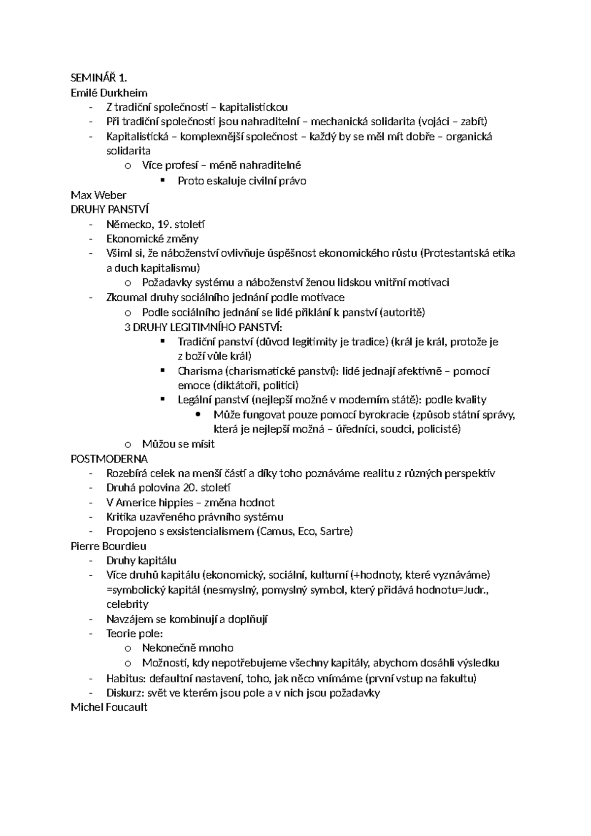 SEMINÁŘ 1: Emilé Durkheim a Max Weber - Teorie společnosti - Studocu