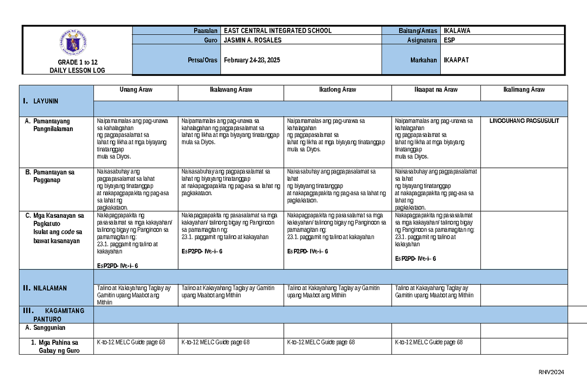 Q4 DLL ESP 2025: Daily Lesson Log for Grade 2 Students - Studocu