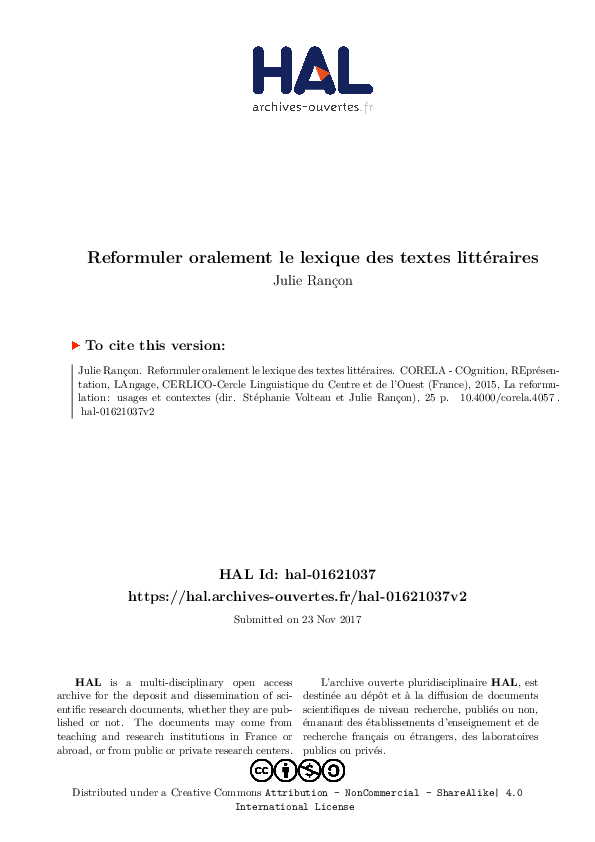 (PDF) Reformuler oralement le lexique des textes littéraires