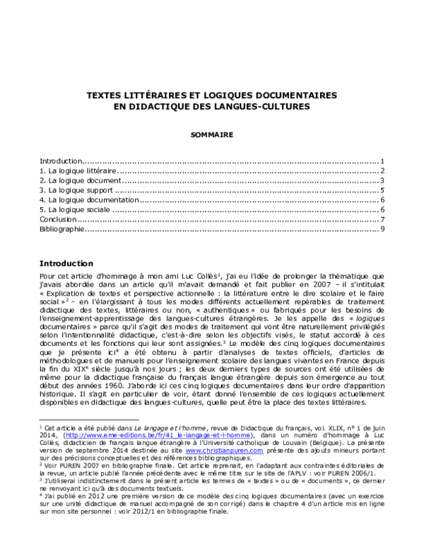(PDF) Textes littéraires et logiques documentaires en didactique des ...