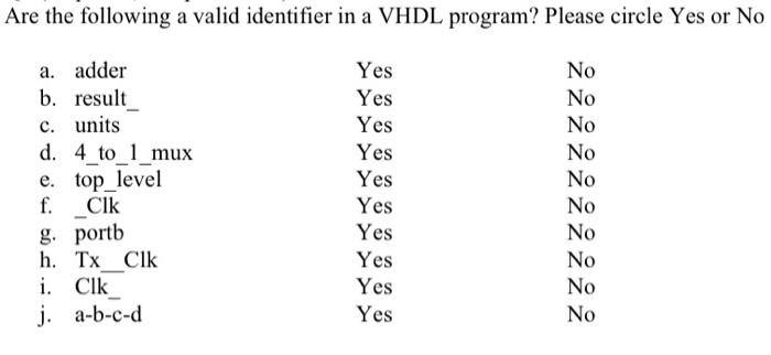 Solved Are the following a valid identifier in a VHDL | Chegg.com
