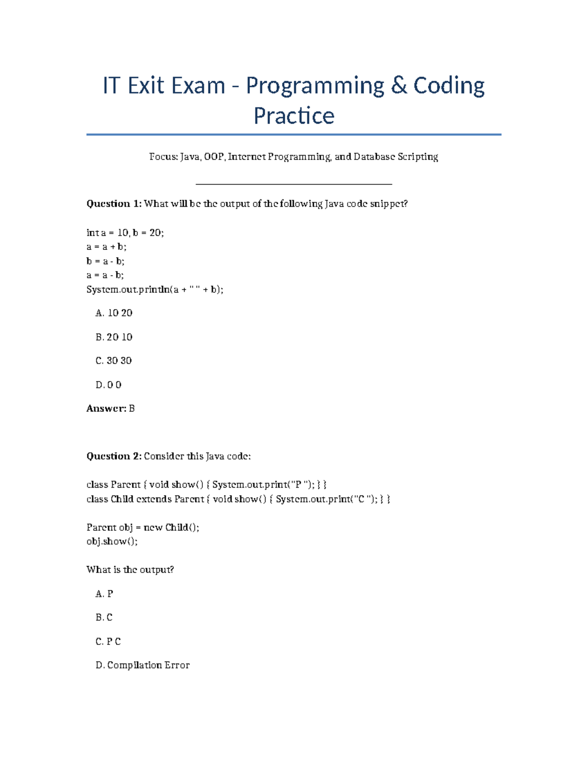 IT Exit Exam Mock - Java, OOP, Internet & DB Scripting - Studocu
