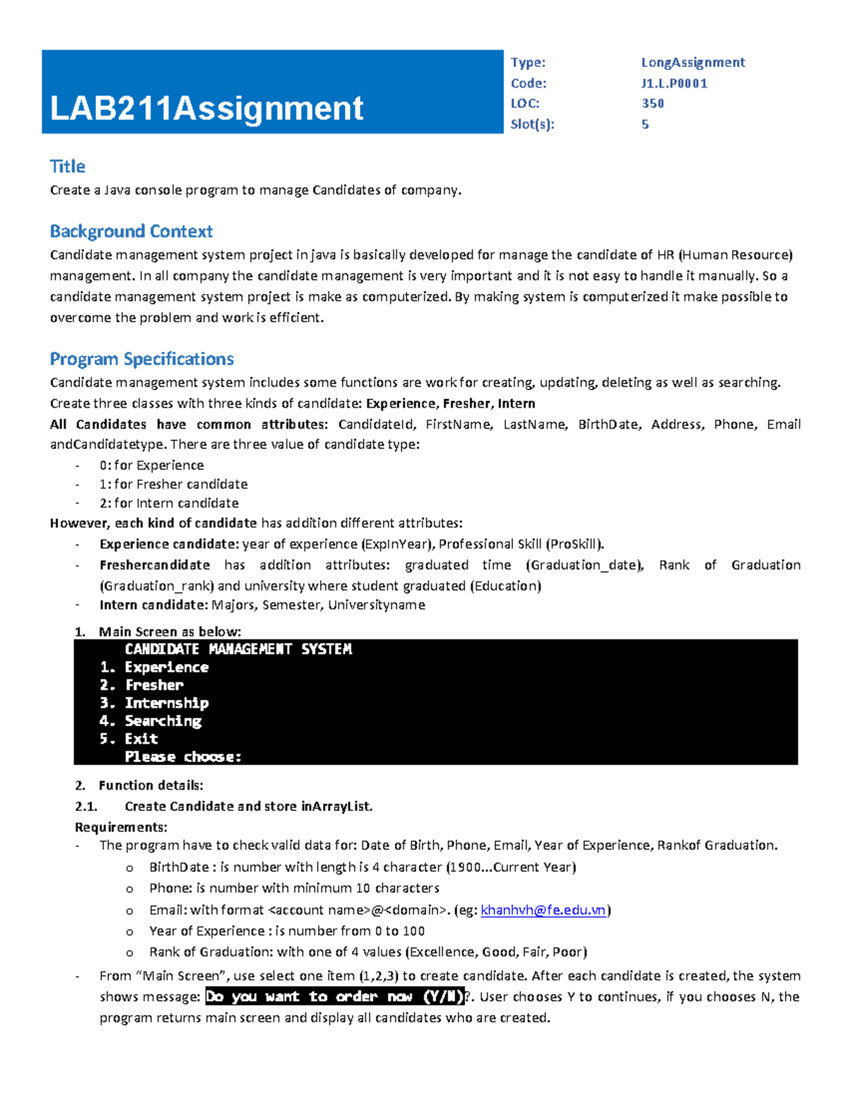 LAB211 Long Assignment: Java Candidate Management System - Studocu