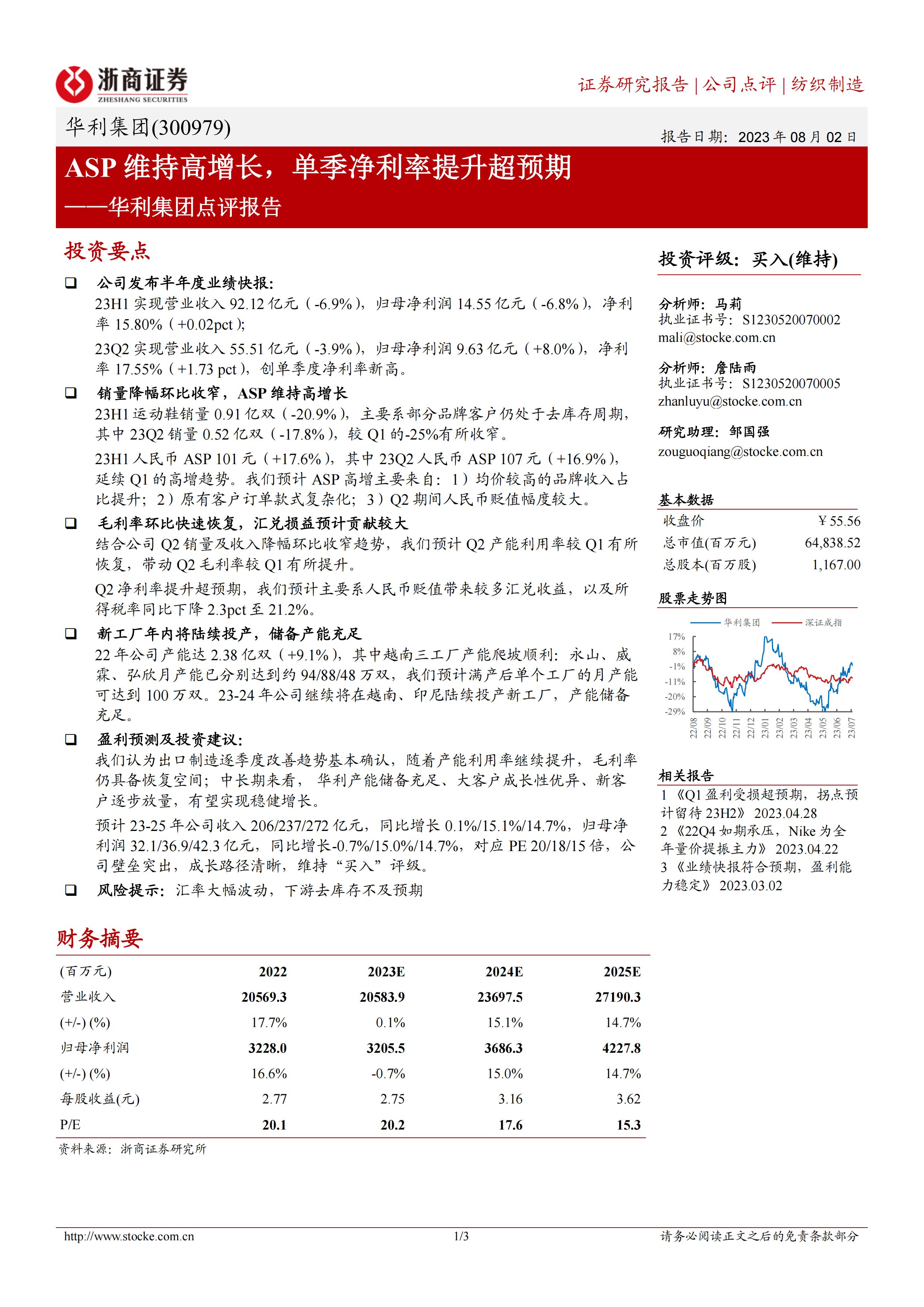 华利集团点评报告:ASP维持高增长,单季净利率提升超预期.pdf-报告查一查