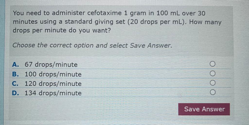 Solved: You need to administer cefotaxime 1 gram in 100 mL over 60 ...