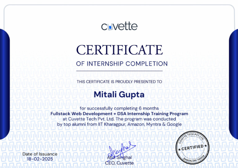 Cuvette Fullstack Development Certificate - Mitali Gupta | PDF