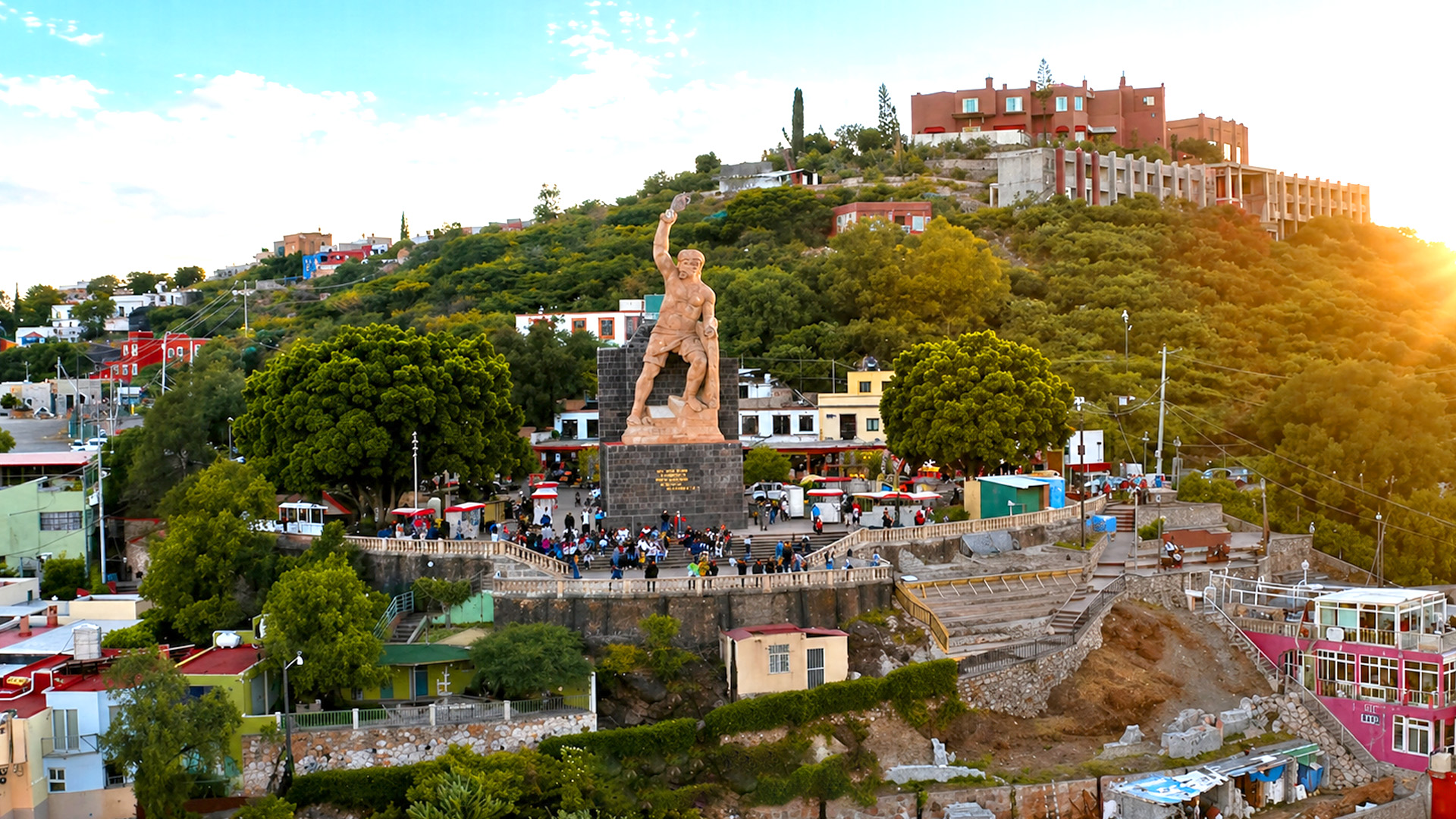 Colorful town beneath giant rock mountain