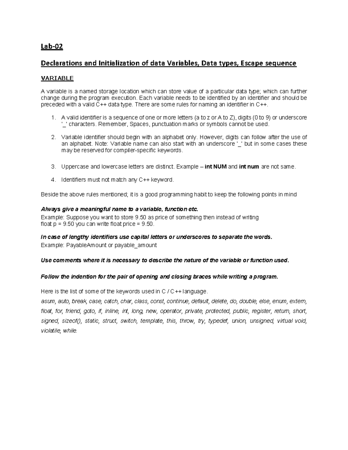 Lab-02 - Lab- Declarations and Initialization of data Variables, Data ...