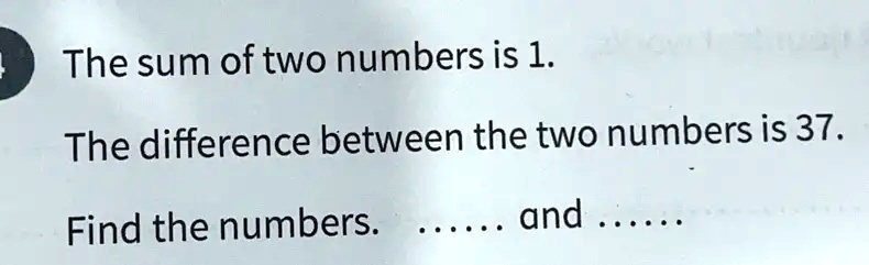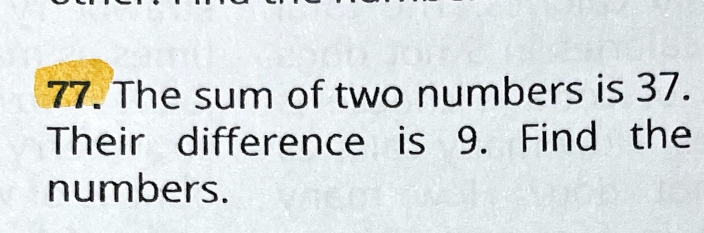 SOLVED: '77. The sum of two numbers is 37. Their difference is 9. Find ...