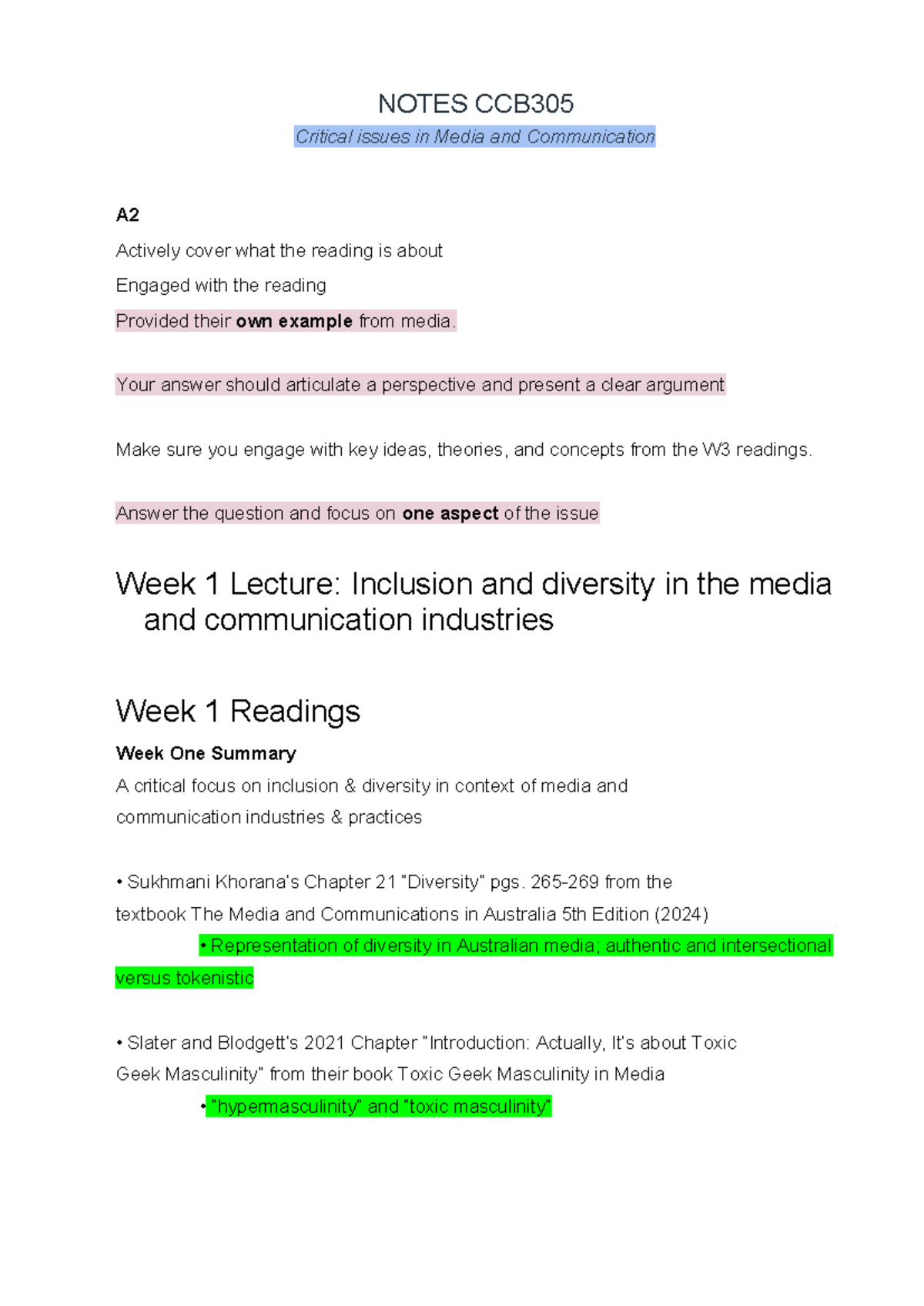 CCB305 Weekly Readings Notes: Critical Issues in Media & Communication ...