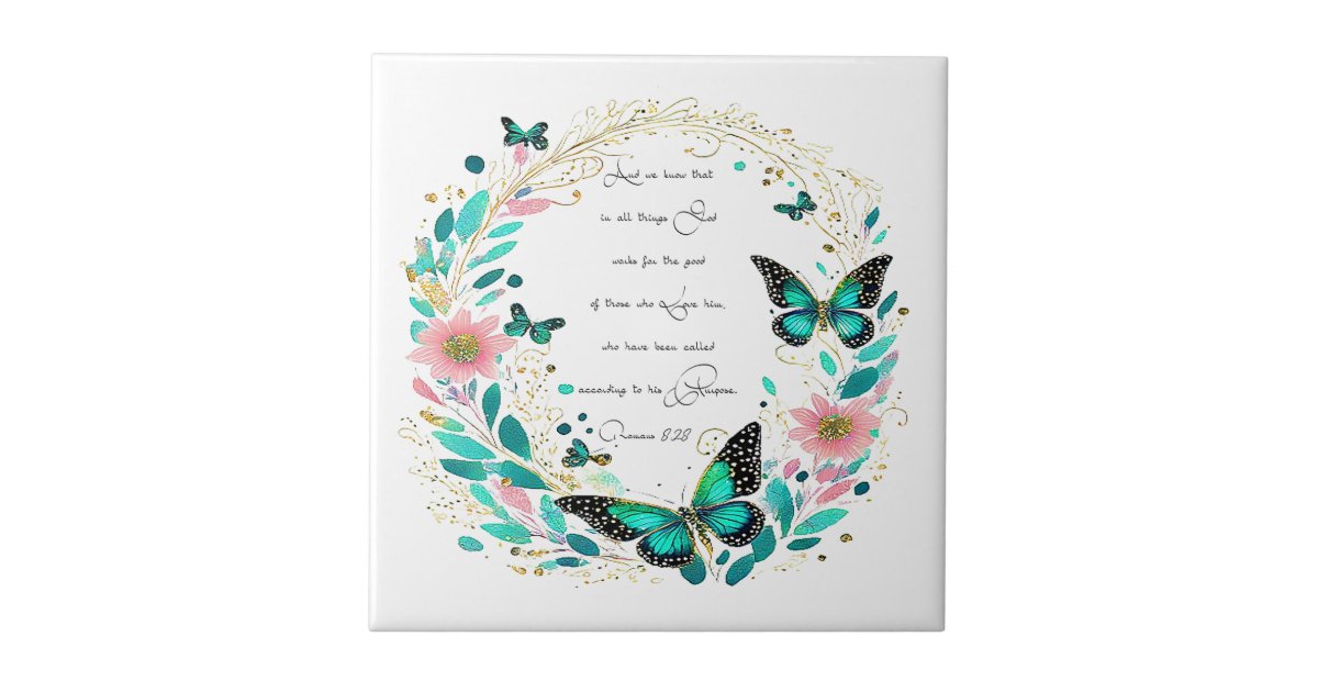 Romans 8:28 Flowers and butterflies Ceramic Tile | Zazzle