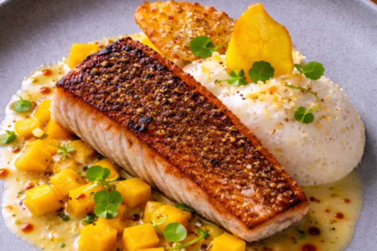 Easy seared red snapper recipe with mango coconut espuma and mango ...