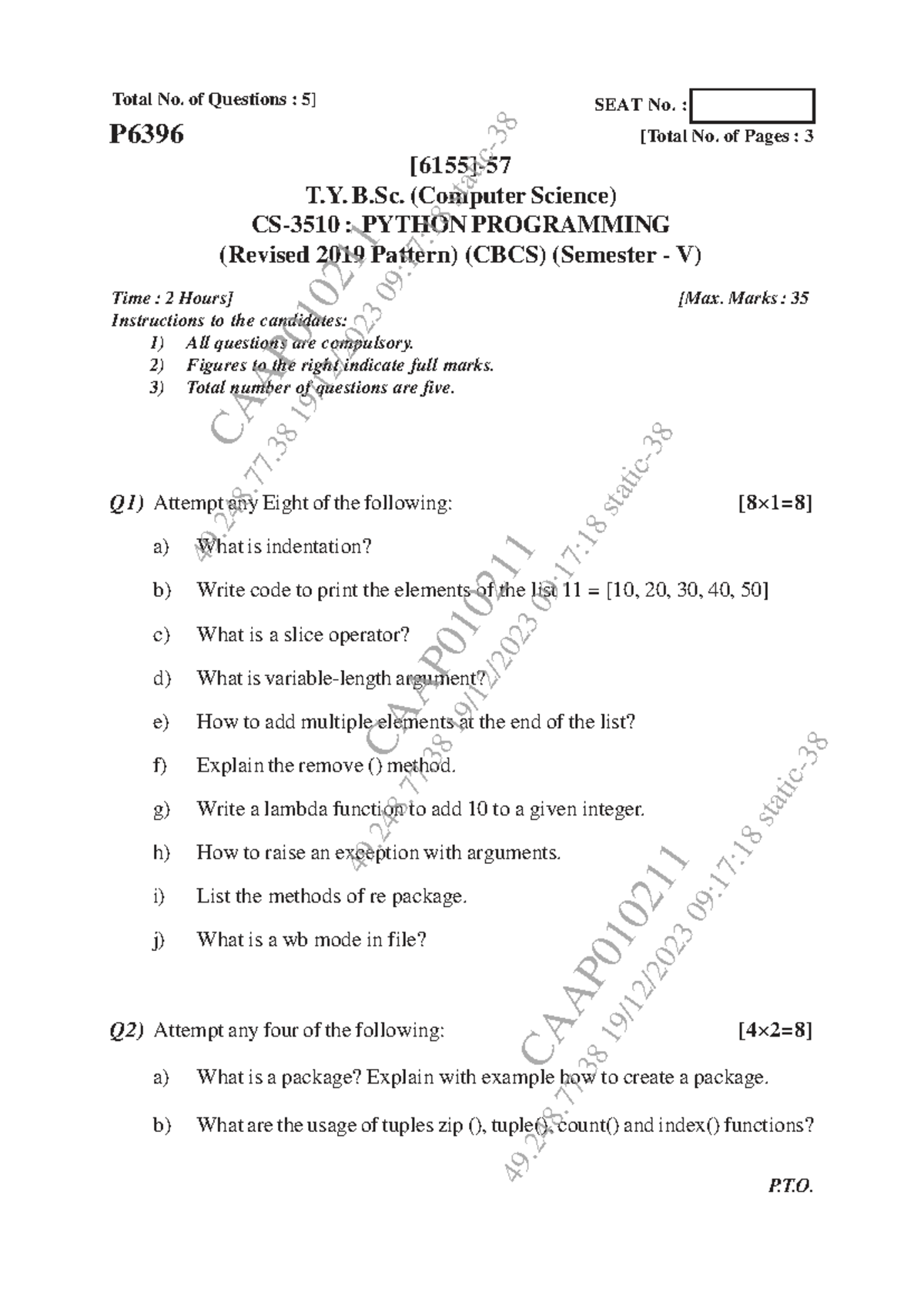 T.Y. B.Sc. (CS) PYTHON PROGRAMMING - Nov 2023 Previous Year Questions ...