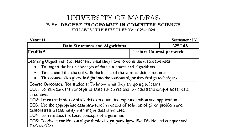 Data Structures & Algorithms Syllabus - B.Sc. CS 225C4A (2023-24) - Studocu