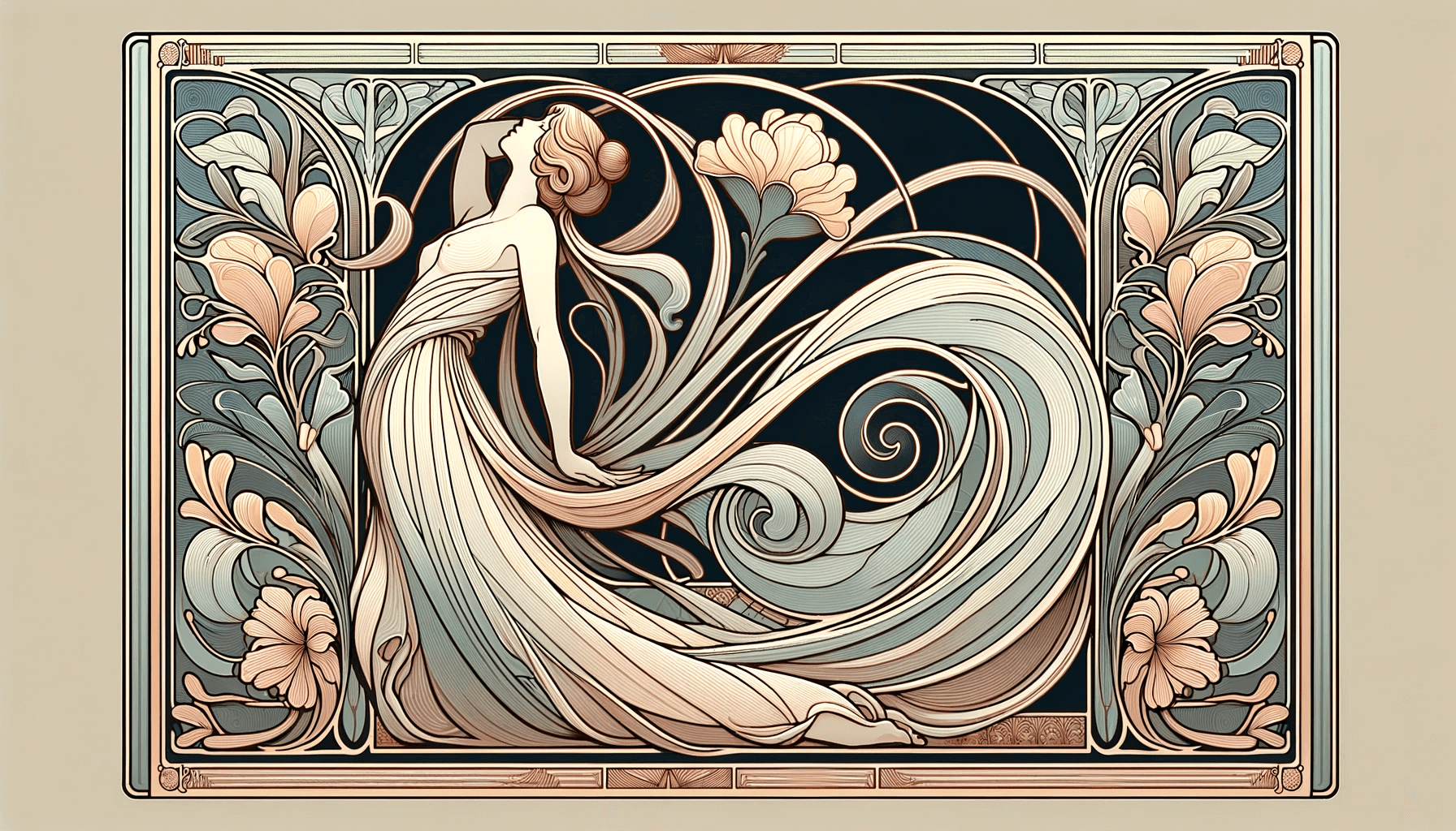 アールヌーボー運動にインスピレーションを得た、髪をなびかせた女性の複雑なイラスト。 | プレミアム写真