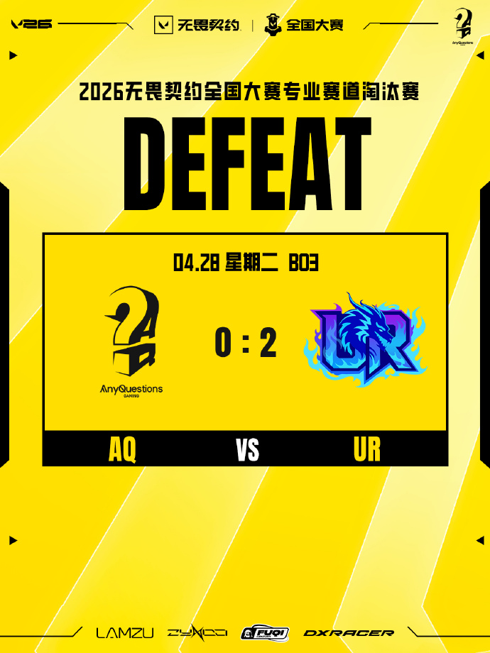 AQ全国大赛零比二输给UR:非常遗憾本次旅程已经止步于此