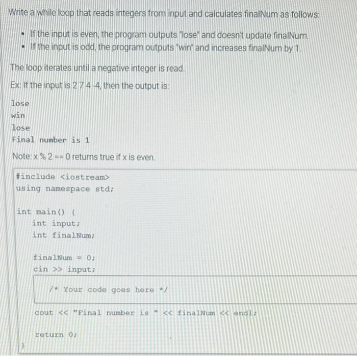 Solved Write a while loop that reads integers from input and | Chegg.com