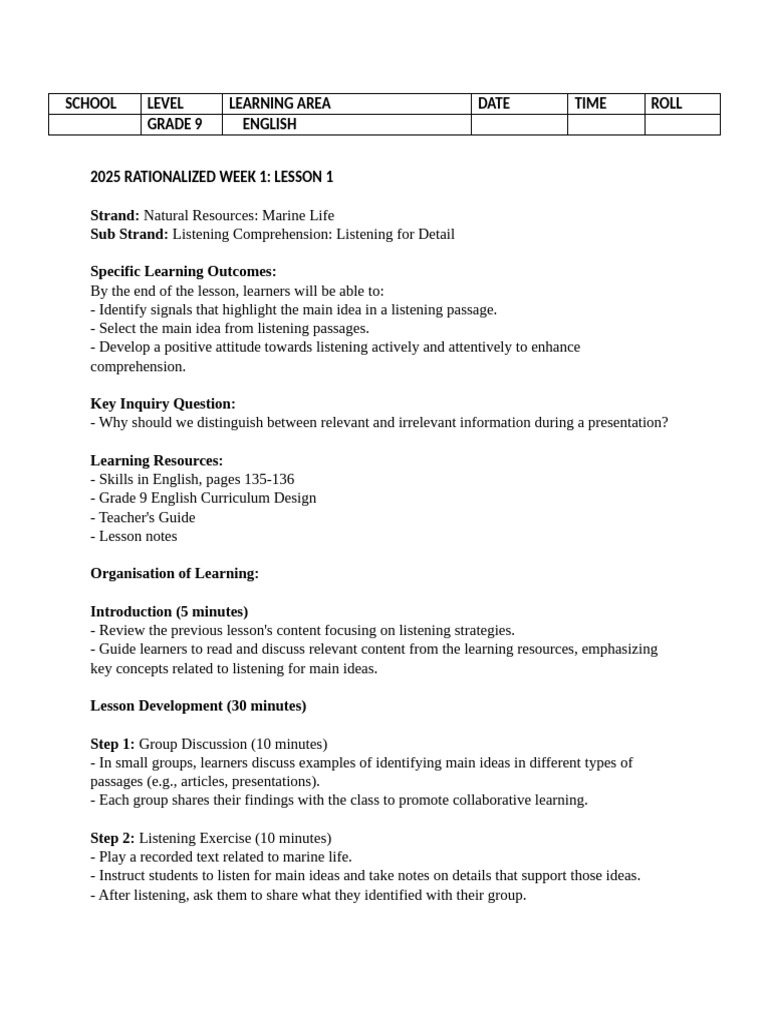Grade 9 Term 2 English Lesson Plans | PDF | Learning | Reading ...