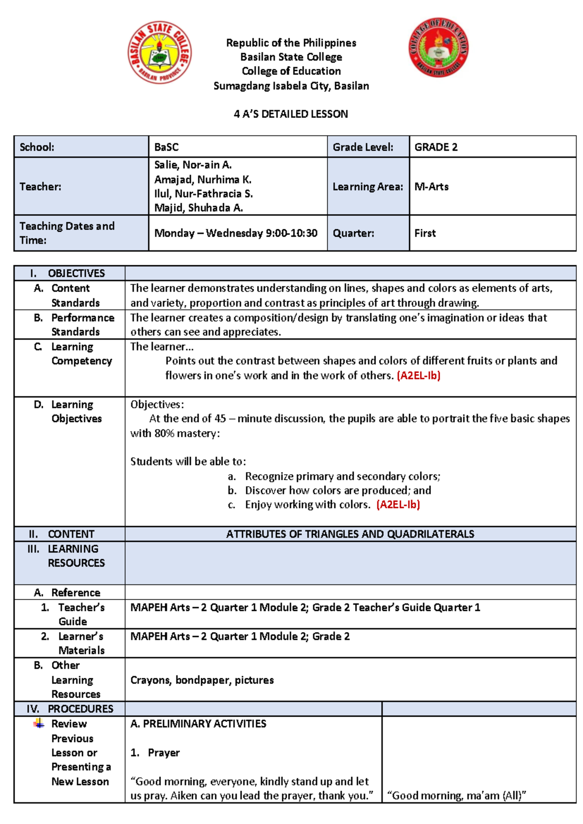 Lesson Plan: MAPEH Arts 2 - Quarter 1 for Grade 2 - Studocu
