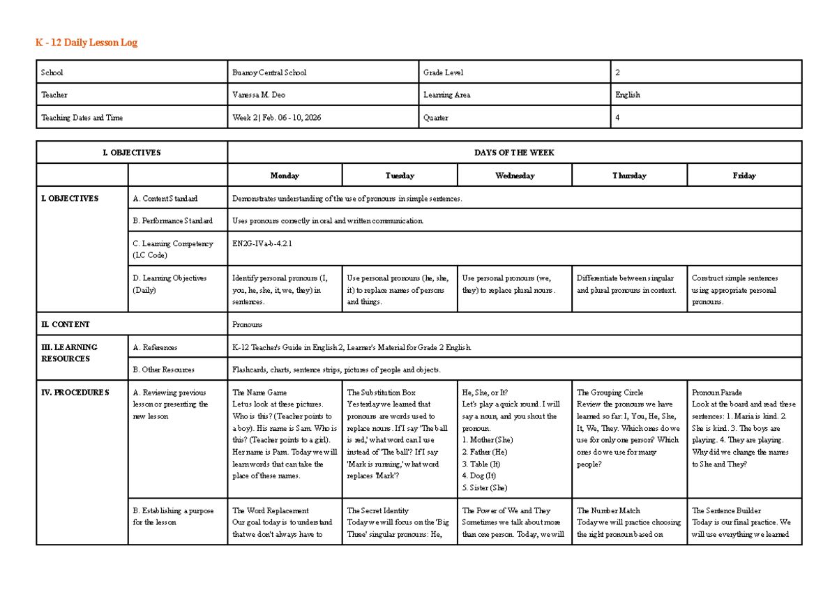DLL K-12 English 2 - Week 2 Lesson Plan on Pronouns - Studocu
