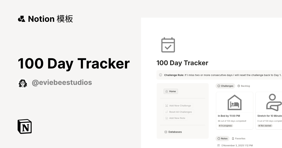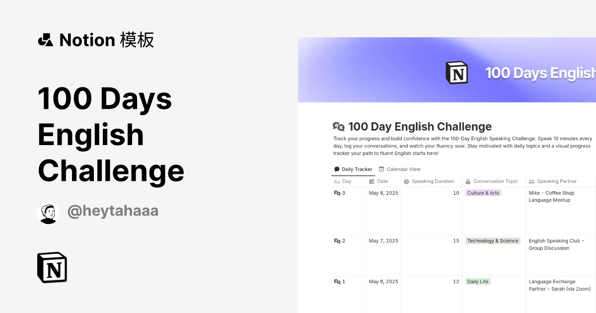 来自 Heytahaaa 的 100 Days English Challenge 模板|Notion市集
