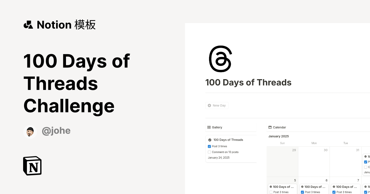 来自 Johe 的 100 Days of Threads Challenge 模板|Notion市集