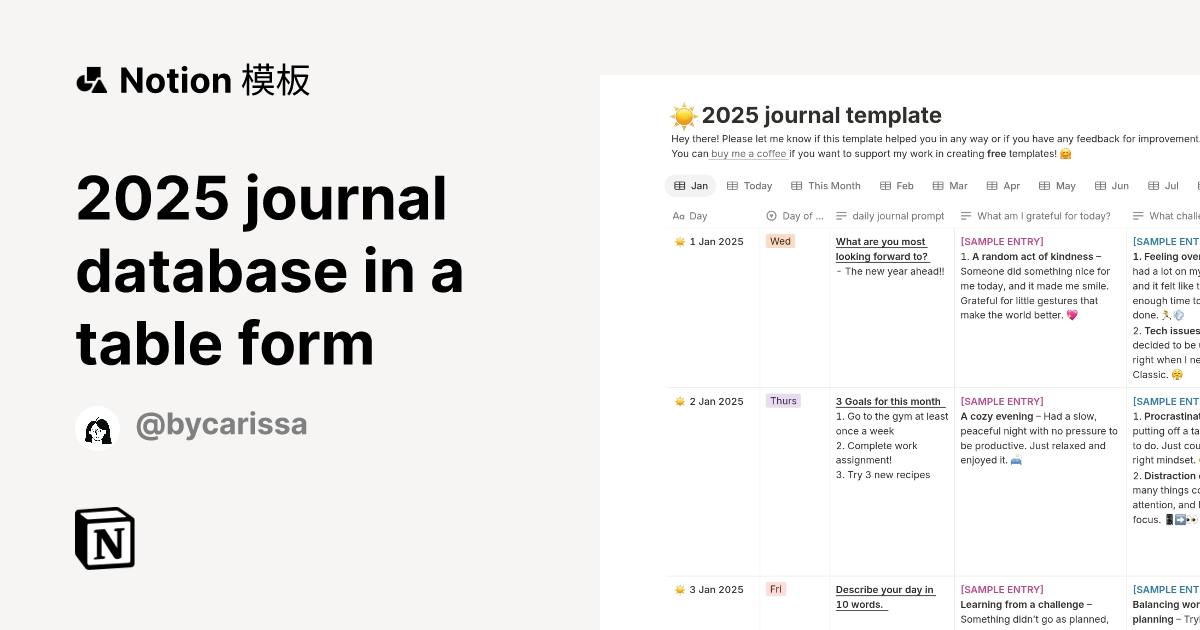 来自 Carissa 的 2025 journal database in a table form 模板|Notion市集