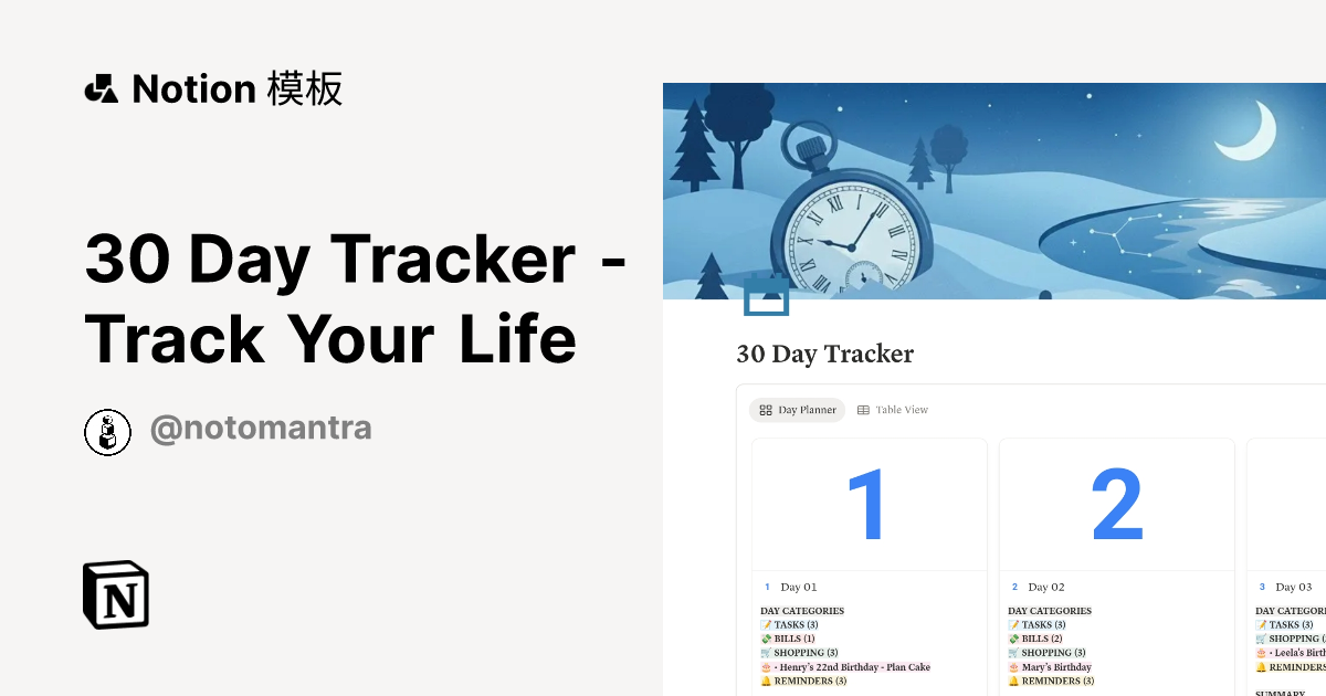 来自 NotoMantra 的 30 Day Tracker - Track Your Life 模板|Notion市集