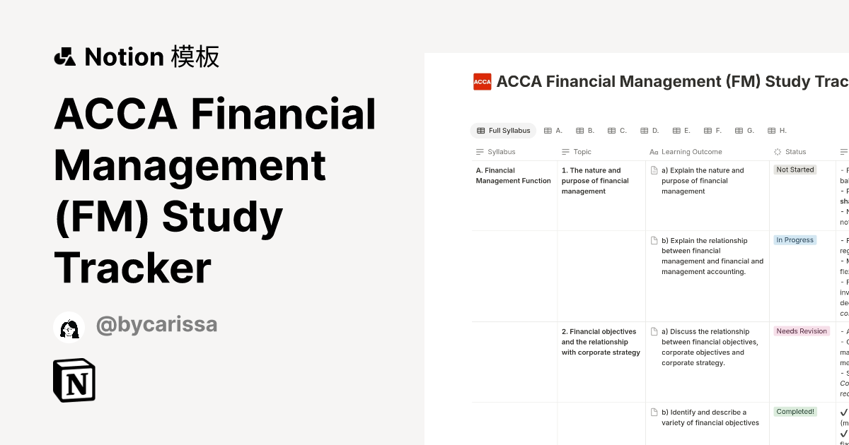 来自 Carissa 的 ACCA Financial Management (FM) Study Tracker 模板|Notion市集