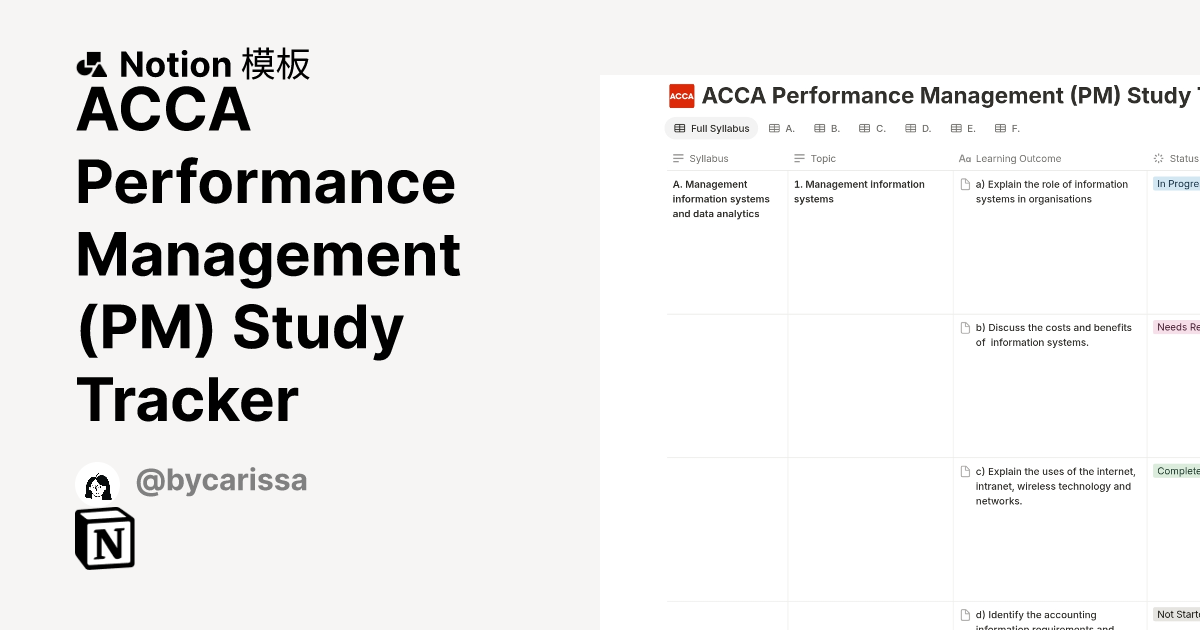 来自 Carissa 的 ACCA Performance Management (PM) Study Tracker 模板|Notion市集