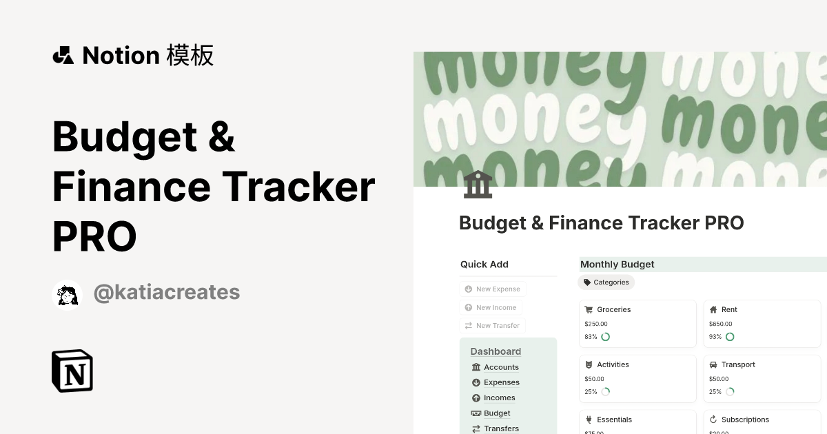 来自 Katia Creates 的 Budget & Finance Tracker PRO 模板|Notion市集