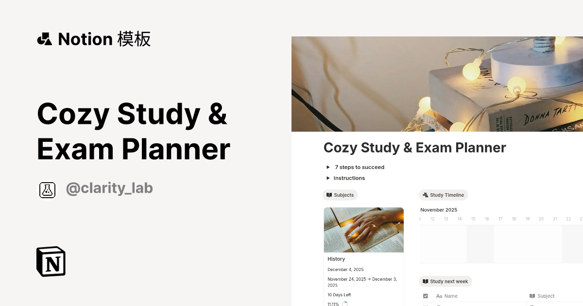 来自 Clarity Lab 的 Cozy Study & Exam Planner 模板|Notion市集
