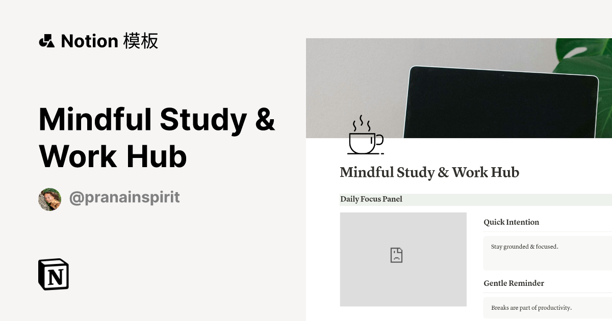 来自 Pranainspirit 的 Mindful Study & Work Hub 模板|Notion市集