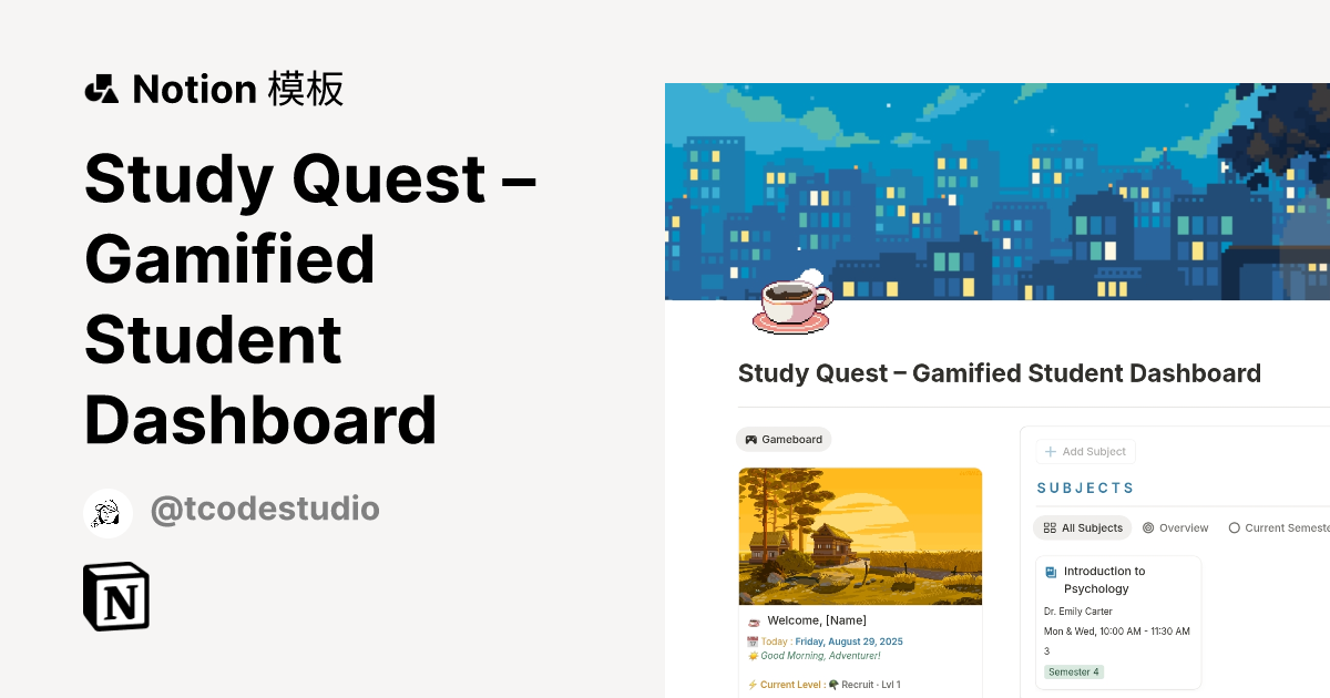 来自 tcodestudio 的 Study Quest – Gamified Student Dashboard 模板|Notion市集