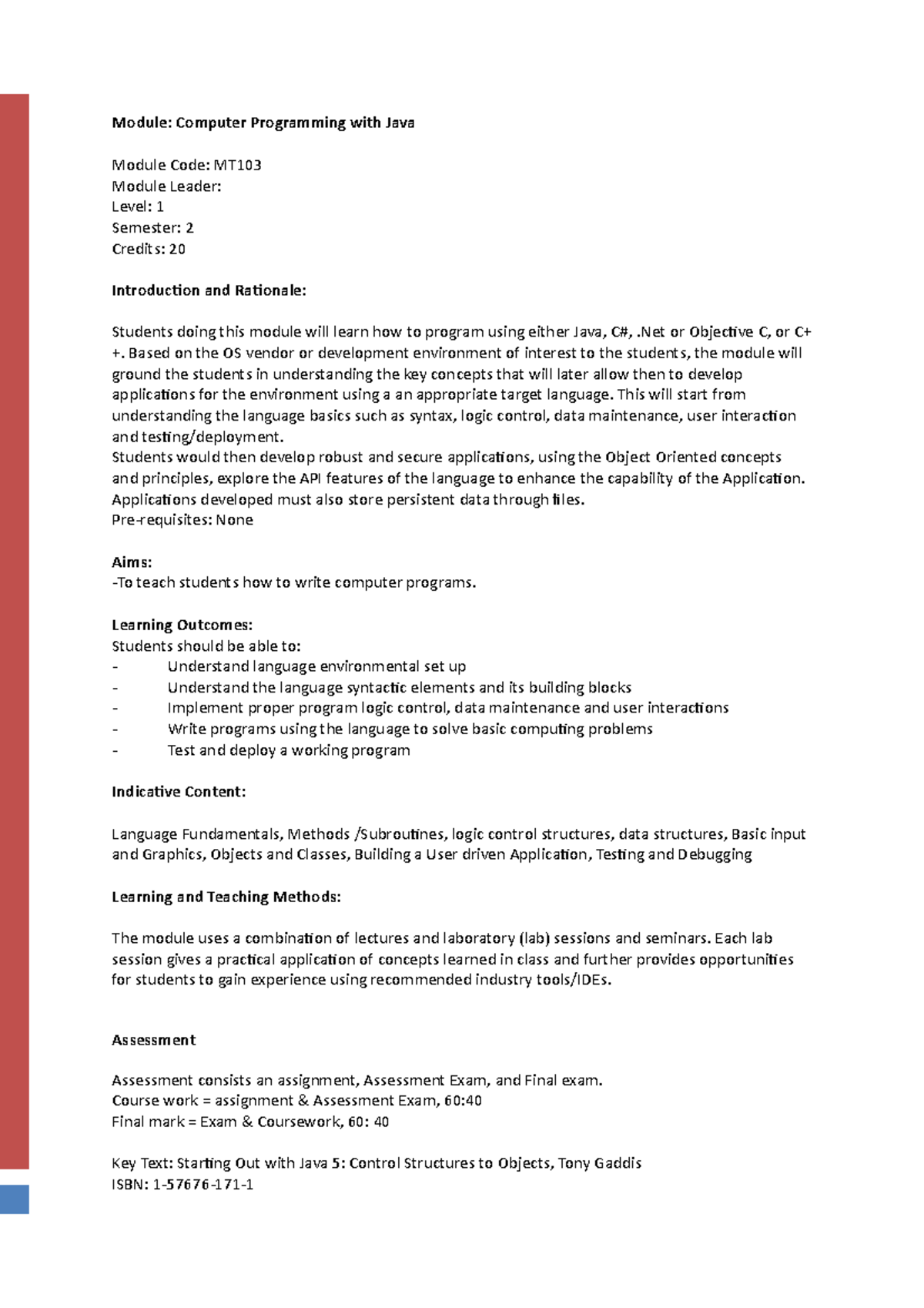 Module Delivery Schedule java - Module: Computer Programming with Java ...