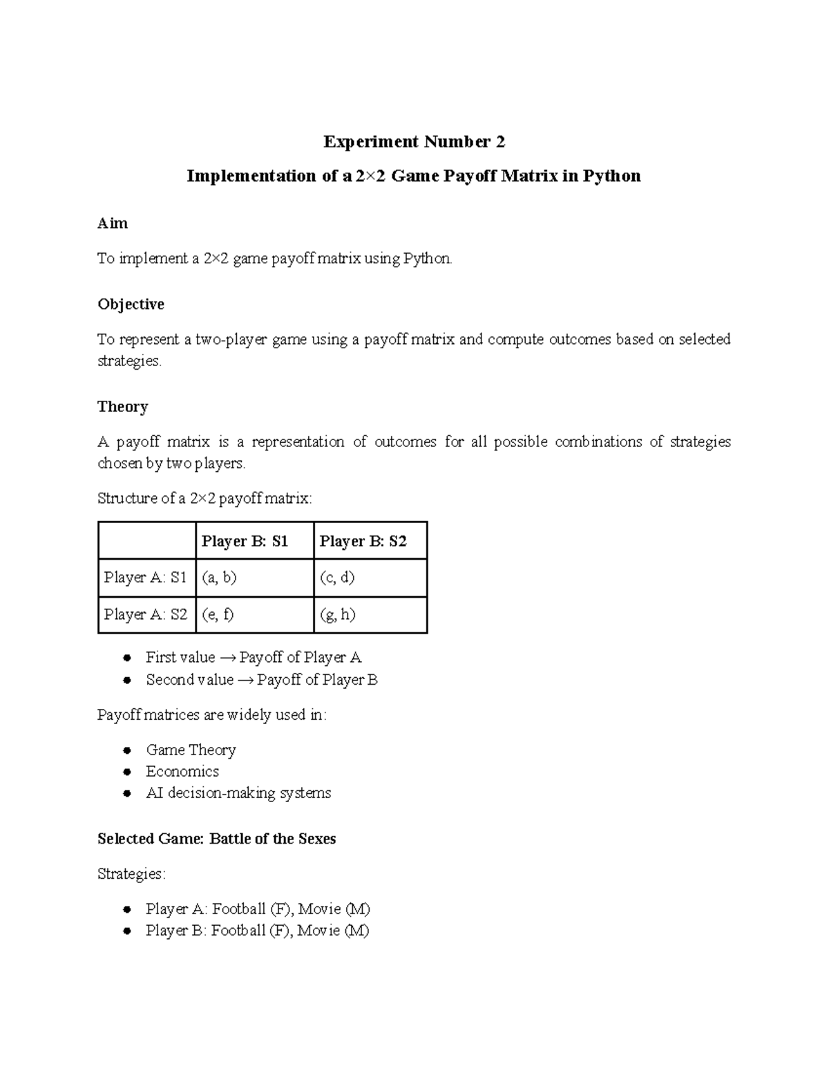 AIML 2 29 - Implementing Game Payoff Matrix in Python - Studocu
