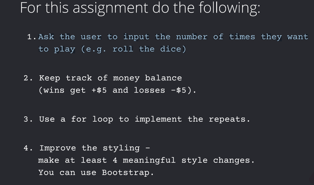Solved Please help me complete my dice game in javascript | Chegg.com