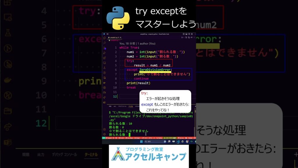 ワンポイントPython⑥ try exceptをマスターしよう #python #プログラミング #プログラミング入門 #プログラミング ...